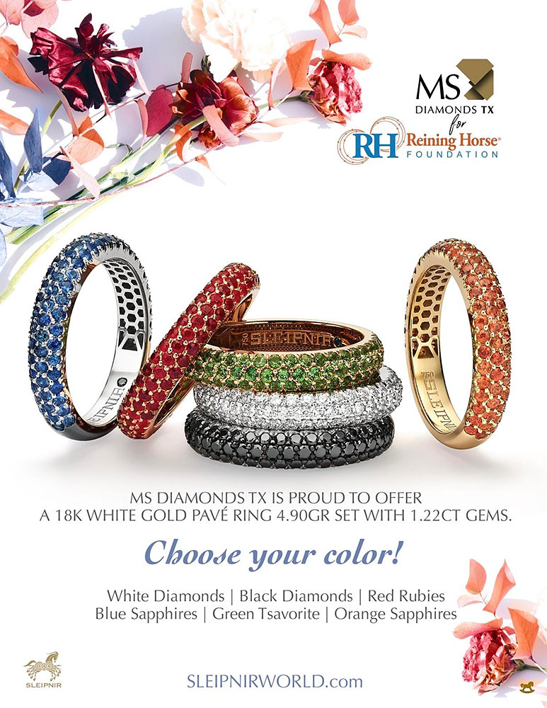 Donated by and Created by MS Diamonds TXThis dazzling ring can be yours in your choice of size and colors. It is an 18K white gold pavé ring, 4.90GR set with 1.22CT gems. Choose from white diamonds, black diamonds, red rubies, blue sapphires, green tsavorite or orange sapphires. MS Diamonds TX is a longstanding supporter of the RHF.
