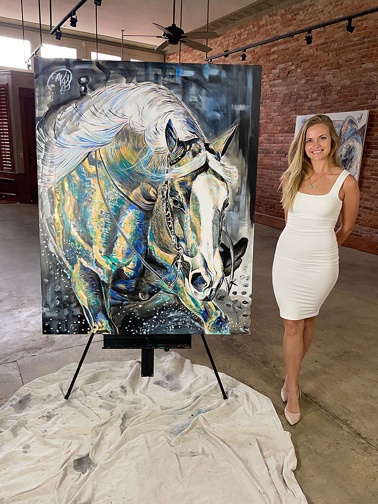 Created by MJ’s Equine ArtArtist Maggie Leverett created this original painting at the NRHA Futurity trade show in the days leading up to this auction. She has been a multiyear donor to the RHF, creating works that generated buzz and bids for auctions at The Run For A Million in 2021 and 2022. Maggie writes, “As her soul mission, she deeply desires to bring back connection flooding a disconnected world.”