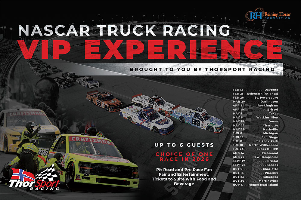 Brought to you by ThorSport RacingExperience a NASCAR Truck Race VIP style with multi-championship team, ThorSport Racing! This package for up to 6 people will take you to the 2026 race of your choice. You’ll be in the heart of the action, with pit road access; enjoy pre-race fanfare and entertainment; and watch the race in the comfort of a suite stocked with food and beverages.